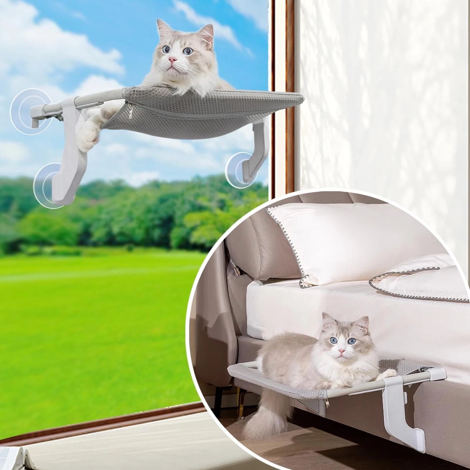 # Cat Hanging Bed | Cat Bed Window Your feline friend deserves a cozy perch with a view! This ingenious hanging bed transforms any window into the ultimate cat lounging spot. Suspended securely with sturdy suction cups, it offers your kitty a front-row seat to outdoor entertainment—birds, squirrels, and passing activity—while keeping them safely indoors. **Why cats love it:** - Prime window real estate for bird-watching adventures - Elevated comfort that satisfies natural climbing instincts - Gentle swaying motion creates a soothing, nest-like experience - Keeps curious paws off your furniture **Built to last:** Durable construction supports cats of various sizes, with reinforced stitching and reliable suction cup anchors that hold firm against even the most enthusiastic loungers. Easy to install, simple to clean, and designed for year-round use. Give your cat the window seat they've always dreamed of—entertainment, comfort, and peace of mind, all in one clever design.