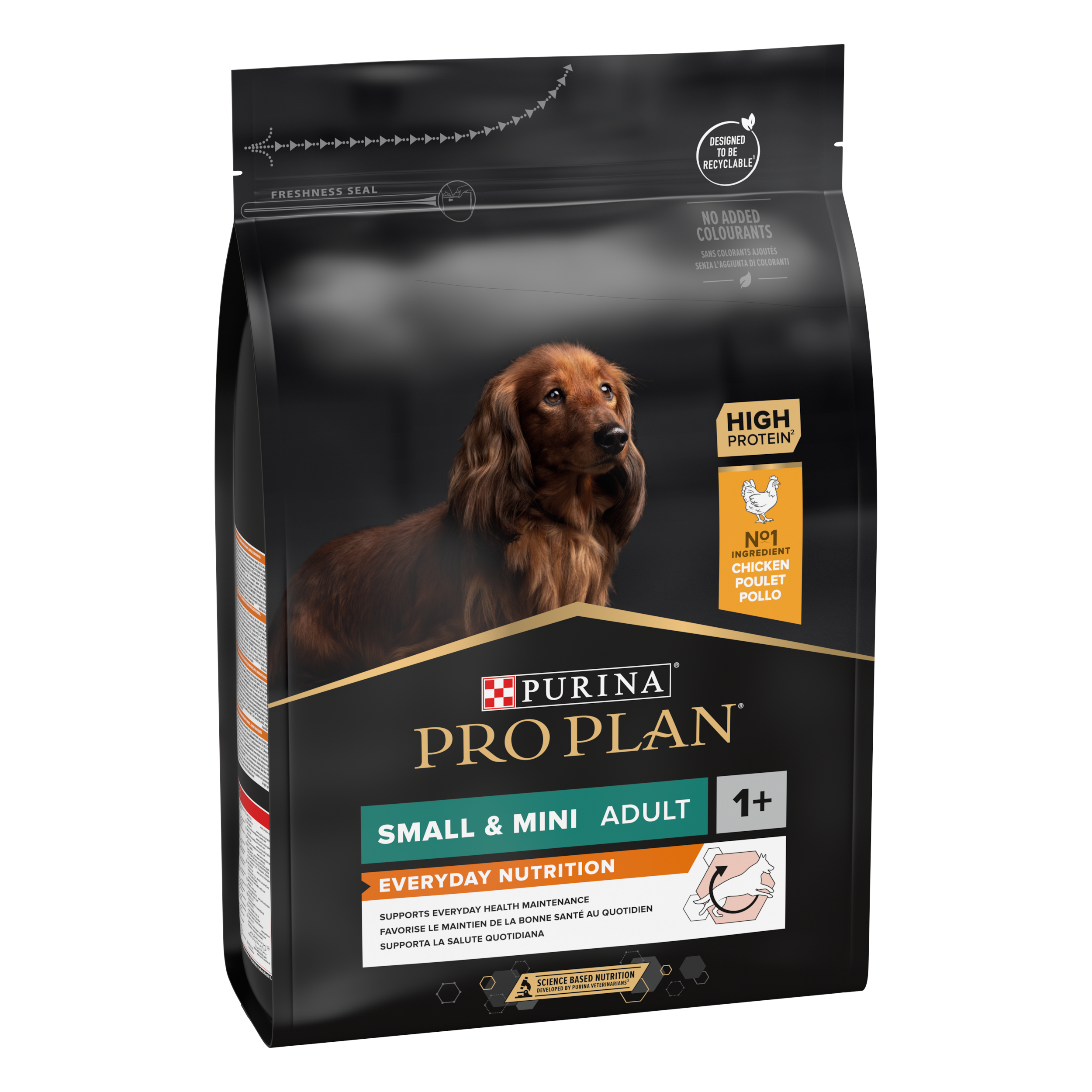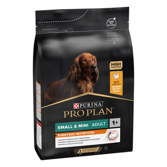 Purina PRO PLAN Everyday Nutrition SMALL&;MINI ADULT has been developed for adult dogs of small &; mini breeds (less than 10 kg weight). This dry dog food contains vitamin D, minerals and specific levels of omega-3 (0.3%) to help support healthy teeth and gums. It is rich in high-quality chicken and provides optimal nutrition for your small &; mini-sized dog's adventures from 12 months to 9 years of age, when you should transition to the Age Defence formula.