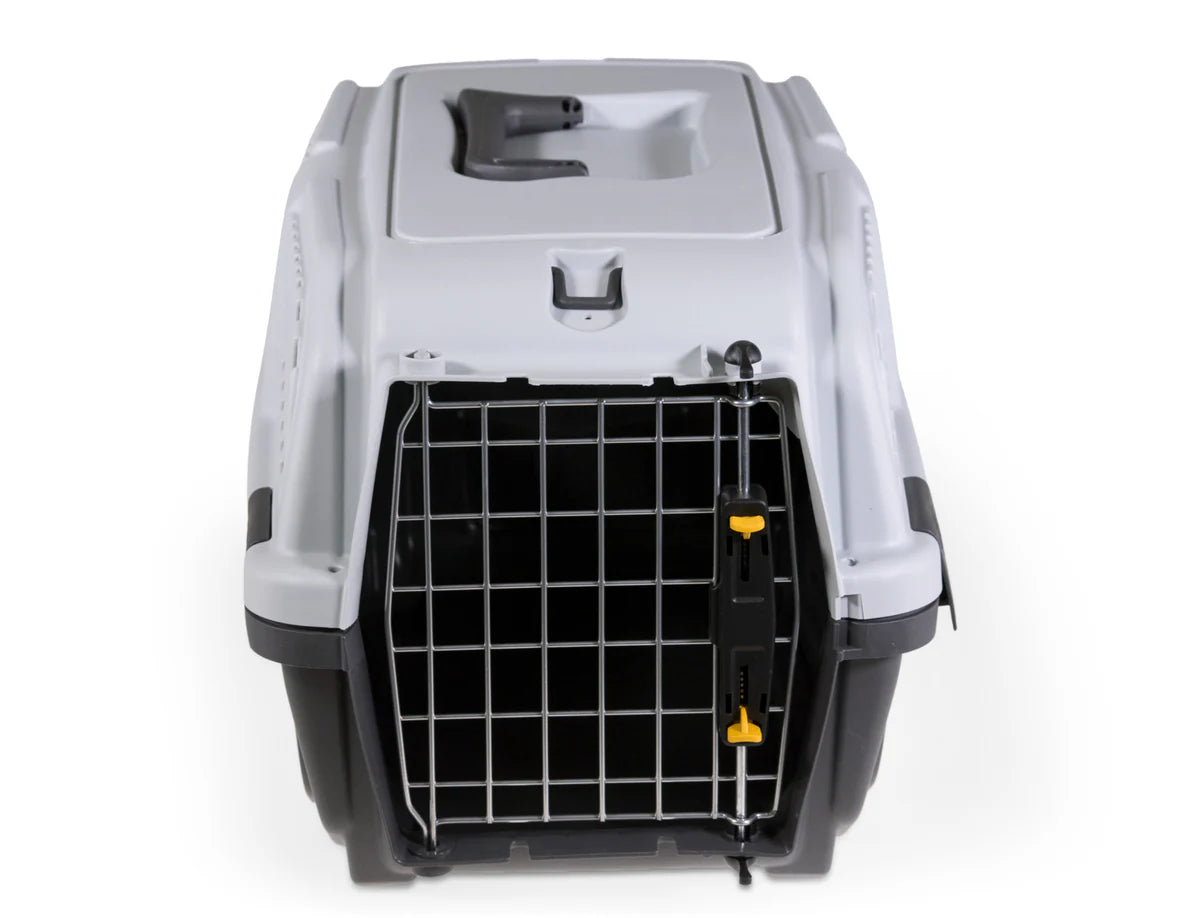 Meet the Skudo 1 IATA carrier—your medium to large dog's passport to adventure! This sturdy grey travel companion checks all the boxes for air travel compliance, so your pup can join you on flights (always confirm with your airline first). The rotating trolley handle makes maneuvering a breeze, while secure lockable latches keep everything in place. Bonus pockets store treats, documents, or travel essentials. Whether it's a hotel stay, dog show, or exhibition, this reliable carrier keeps your furry friend safe and comfortable every step of the journey.