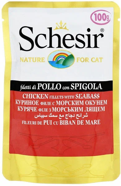 Schesir Cat Tuna Chicken with sea bass is a moist food, good for cats. The top quality in different gelatin flavors to satisfy the palate of your cat: 100% natural ingredients, no artificial colors or preservatives; only the best parts of the fish and meat, cooked in steam and processed manually, in a practical form of packaging 85g.