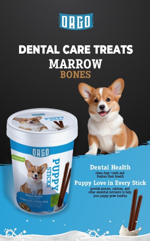 🐾 Start your puppy’s journey to a healthy, happy life with ORGO Puppy Sticks – Marrow Bones Dental Care Treats.
