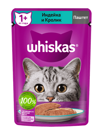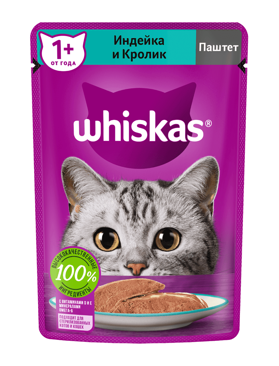 It's a balanced diet prepared exactly the way your cat likes. An appetizing pate with turkey and rabbit will give your pet real pleasure. Life is crazy, because Whiskas® contains everything you need to make your cat's food not only tasty, but also healthy. Whiskas® will support the immune system, take care of healthy digestion and the health of your cat's skin and coat. Suitable for sterilized cats and cats.