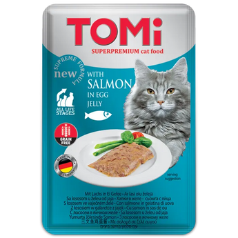 Tastefull and nutritious chunks with salmon cooked in egg jelly is outstanding grain free complete meal for your cat. This meal is developed for all life stages from kitten to mature cat. Vitamines and biotin are added for the benefit of your cat. This meal is absolutely free of added sugar, artificial colour or flavour and most important is GMO free. In our production process we do not use antioxidants and preservatives.
