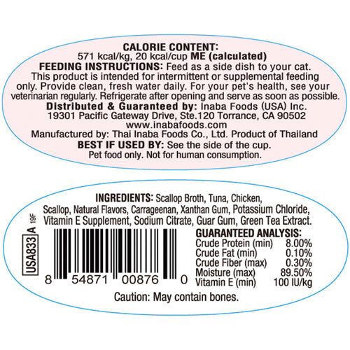 Scallop Broth, Tuna, Chicken, Scallop, Natural Flavors, Carrageenan, Xanthan Gum, Potassium Chloride, VitaminE Supplement, Sodium Citrate, Guar Gum, Green Tea Extract